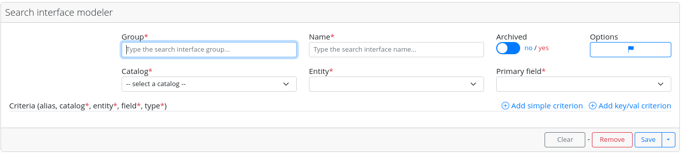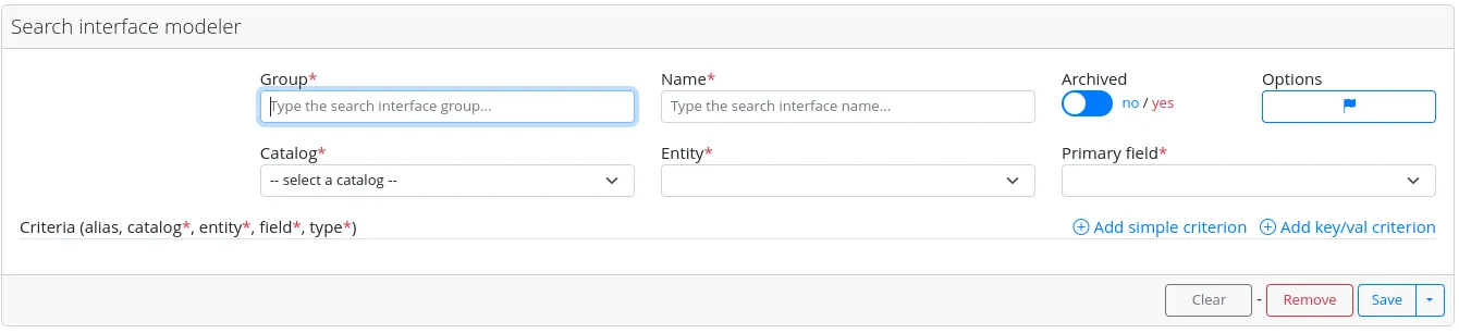 The search modeler interface is divided into two main parts. On the left, there is the “Search interfaces” area where the already configured criteria search interfaces are displayed. On the right, the “Search interface modeler” contains a form for defining new criteria search interfaces.