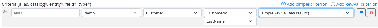 - alias: An optional alias, i.e., the name of the criterion as it will appear in the end-user’s search interface. If not set, the name of the criterion will be the same as that of the entity.