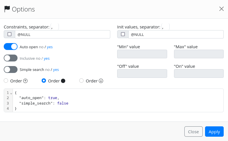- JSON: The criterion options are saved as a JSON dictionary that is displayed in the bottom text area. Options can also be set by directly modifying the JSON dictionary in the text area.