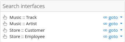 The list item format is [Group]::[Interface Name]. Clicking on an item will display all the already configured criteria in the “Search Interface Modeler” on the left, allowing an administrator to check or edit them. At the end of each item row, there is a drop-down menu labeled “goto,” where an administrator can check the configured interfaces (criteria search and simple search) from an end-user point of view. All the items in the list are draggable and can be reordered by an administrator, so they appear in the desired order for end-users.