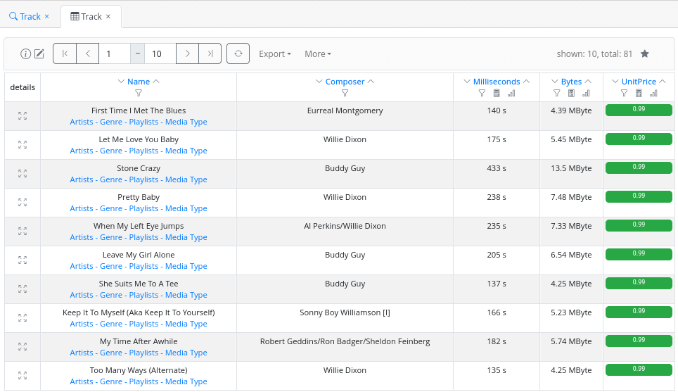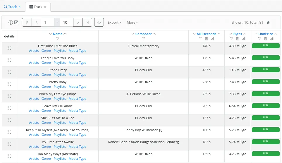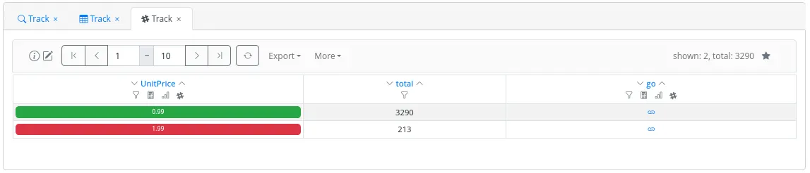 An administrator has the capability to configure certain fields to display in different colors in the results table, based on the field value. For instance, in Figure 21, green corresponds to a track unit price less than or equal to 1.00€, while red is used for tracks with a unit price greater than 1.00€.