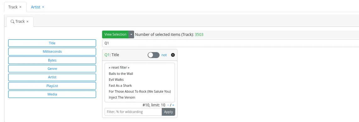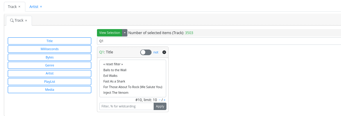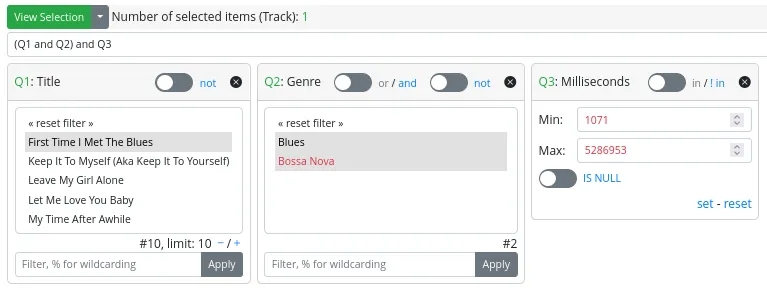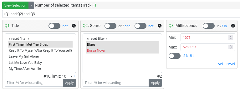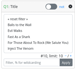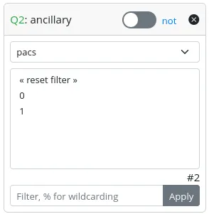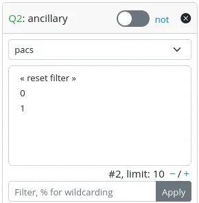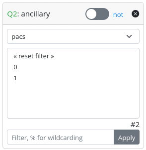- A “not” switch, allowing the search to be conducted considering the selected values or their complementary set.