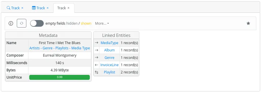 Web links may appear beneath certain field values, as shown in Figure 23. These links enable users to navigate to other metadata associated with the specific record. This additional metadata could be related to other entities within the same database or may be part of an external system.