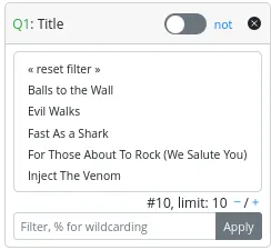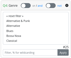 - A filter to select possible values based on a filter value. To apply a filter, the end-user must type a filter value in the text field and click the “apply” button.